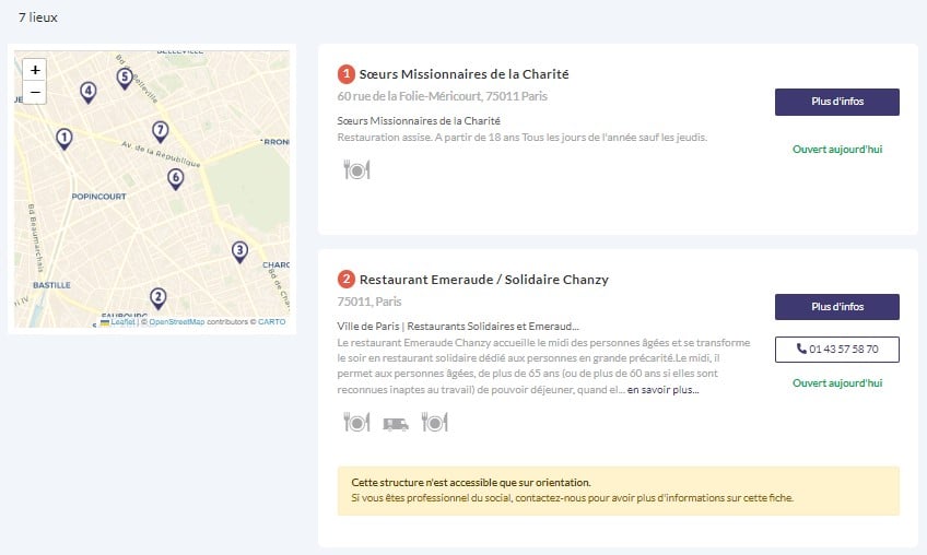 Soliguide est une plateforme qui recense un grand nombre de structures de l’action sociale en France. Il est possible de trouver une distribution de repas chaud, une épicerie sociale, ou des colis alimentaires à la localisation souhaitée. Il suffit de rentrer son besoin « distribution de repas » par exemple, ainsi que sa localisation « 11ème arrondissement de Paris » et la plateforme proposera une liste de structures offrant le service recherché.