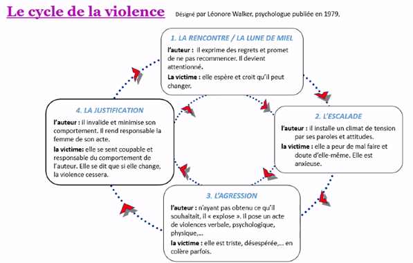 La violence conjugale est une atteinte à l’intégrité physique et morale de la personne. Elle s’exerce au sein d’un couple et s’inscrit dans un rapport de domination. Il existe différents types de violences : psychologiques (toujours présentes), physiques, sexuelles, administratives, financières et les cyberviolences. Il existe un cycle de la violence, un schéma qui se répète dans la majorité des situations de violences conjugales.